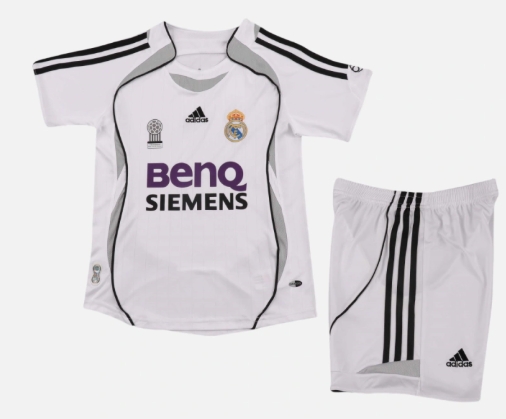 The Real Madrid 2006/07 Home Kids Kit marks a memorable season when the team clinched the La Liga title in a thrilling finale, led by iconic players like Raúl, David Beckham, and van Nistelrooy.